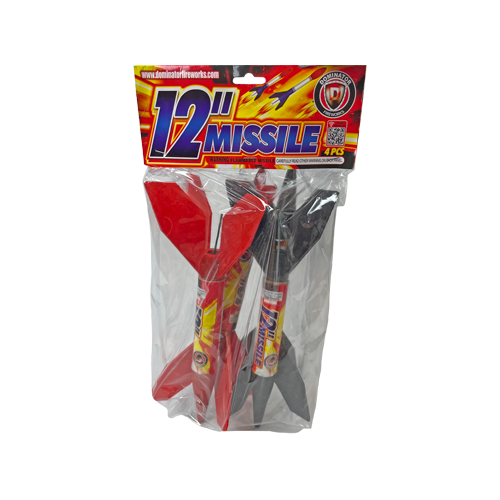 A big missile with a big payoff! These 12" missiles will not disappoint as they shoot through the sky a lot further than your average 6-incher.... 4 missiles per pack, and 18 packs per case for a total of 72 missiles. Fun for the entire night! From Dominator Fireworks