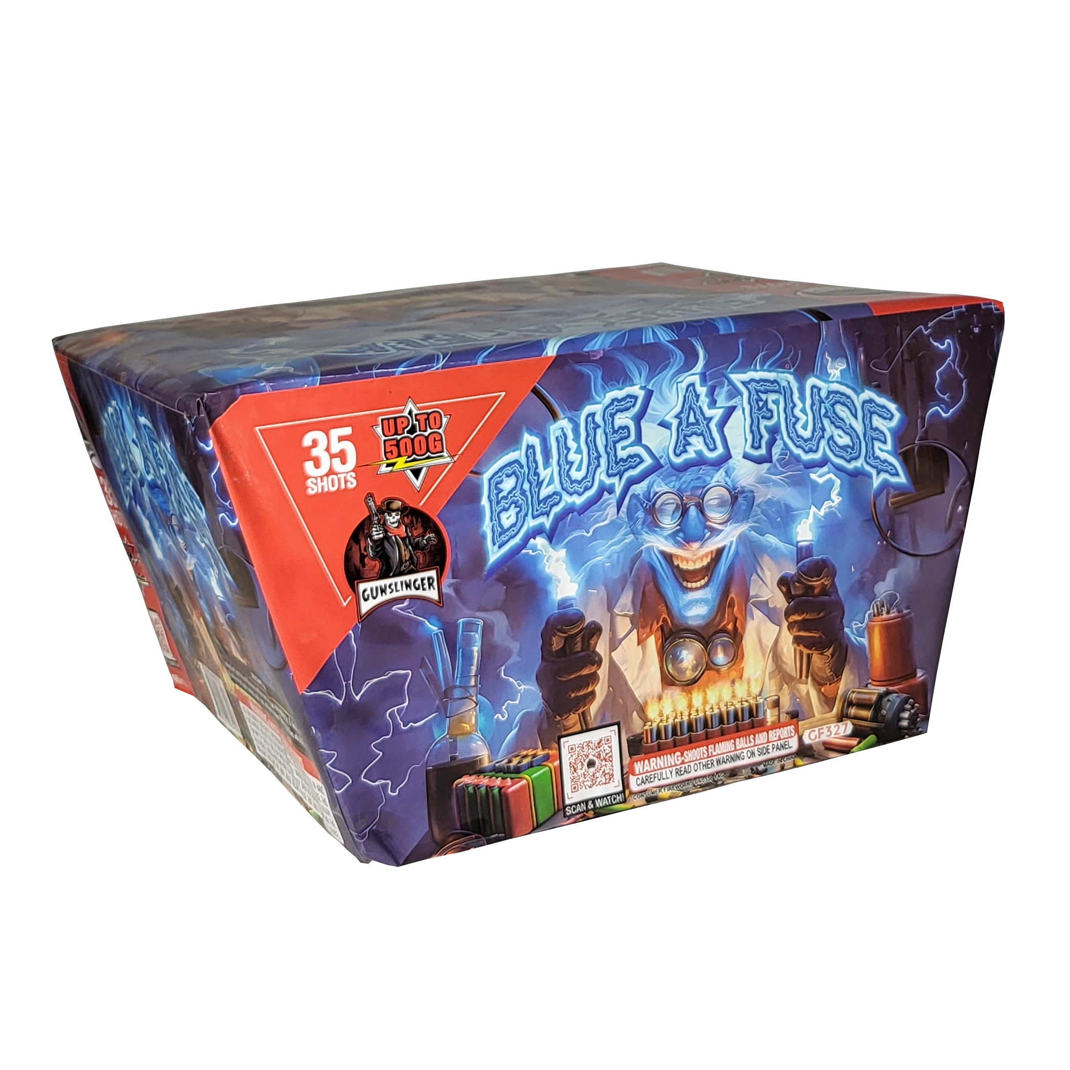 Blue mines and blue stars with gold tails highlight this 35 shot cake. Mixed in are red, green, orange, purple, cyan, and lemon dahlias. Blow up your blues!