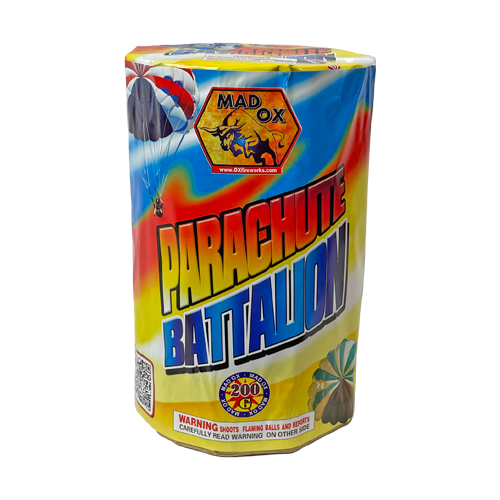 Parachute Battalion has multiple parachutes in every shot means dozens to chase! A favorite daytime item. From Mad Ox Fireworks